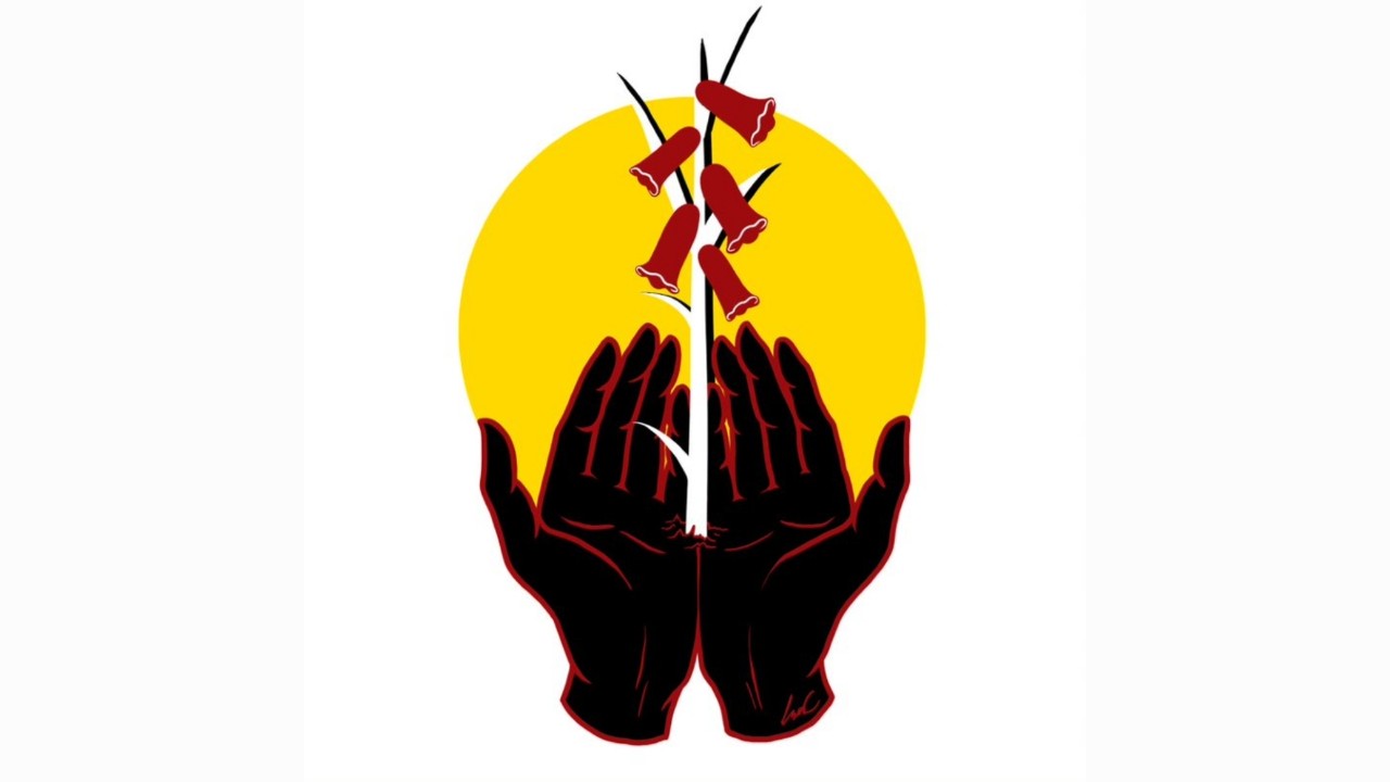 Finalist Isabeau Colls's 2020 NAIDOC Week Indigenous art competition design: "The hands show that our ancestors are the life of the land. The native Australian Pink Heath flower grows relentlessly, just like our culture, it will never be destroyed. The circle shows the sun rises and falls with us, always ours."