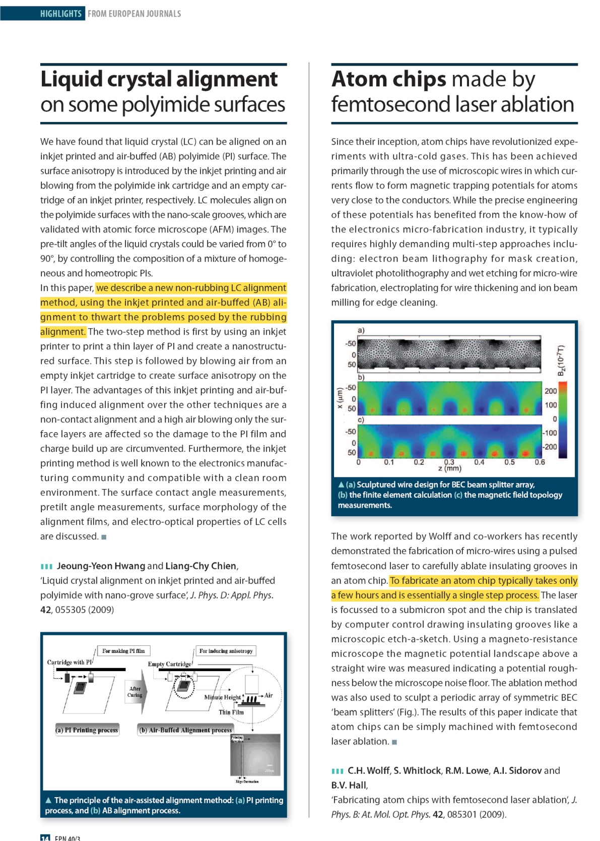 Europhysics News highlights atom chip fabrication with fs-laser ablation.