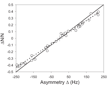 Fractional number difference (ΔN/N) versus the double-well potential asymmetry (Δ). The experimental
