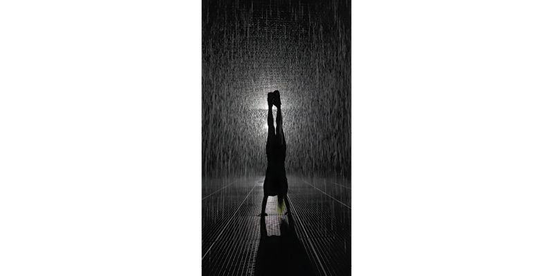 Artwork description: "Captured within the ethereal ambiance of a rain room, where liquid becomes poetry and gravity dances with defiance. Amidst the serenade of falling droplets, a figure emerges, suspended in a moment of fearless grace. Balanced delicately on the palms of their hands, they challenge convention, embracing the rain with an audacious handstand. Each droplet, a fleeting brushstroke in the canvas of their movement, adds depth to the narrative of freedom and liberation. Through this lens, we witness not just a physical feat, but a symphony of courage and artistry, inviting us to reimagine our relationship with the elements and the boundaries of human expression."