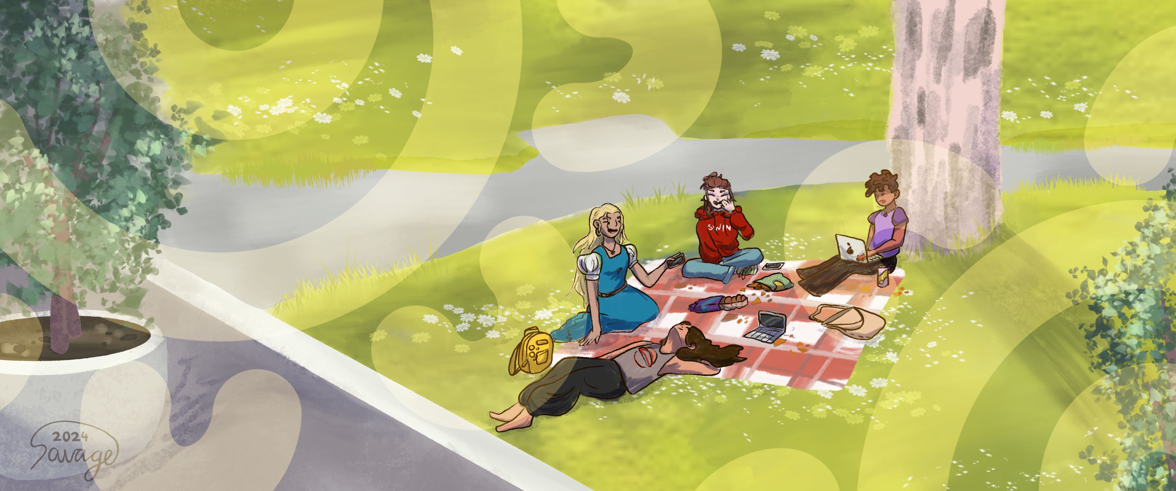 Artwork description: "Study picnics on campus with friends, my favourite thing about uni. The meeting new people, the learning new things, the little moments of sunshine, they are things I'm sure I'll think about for a lifetime."