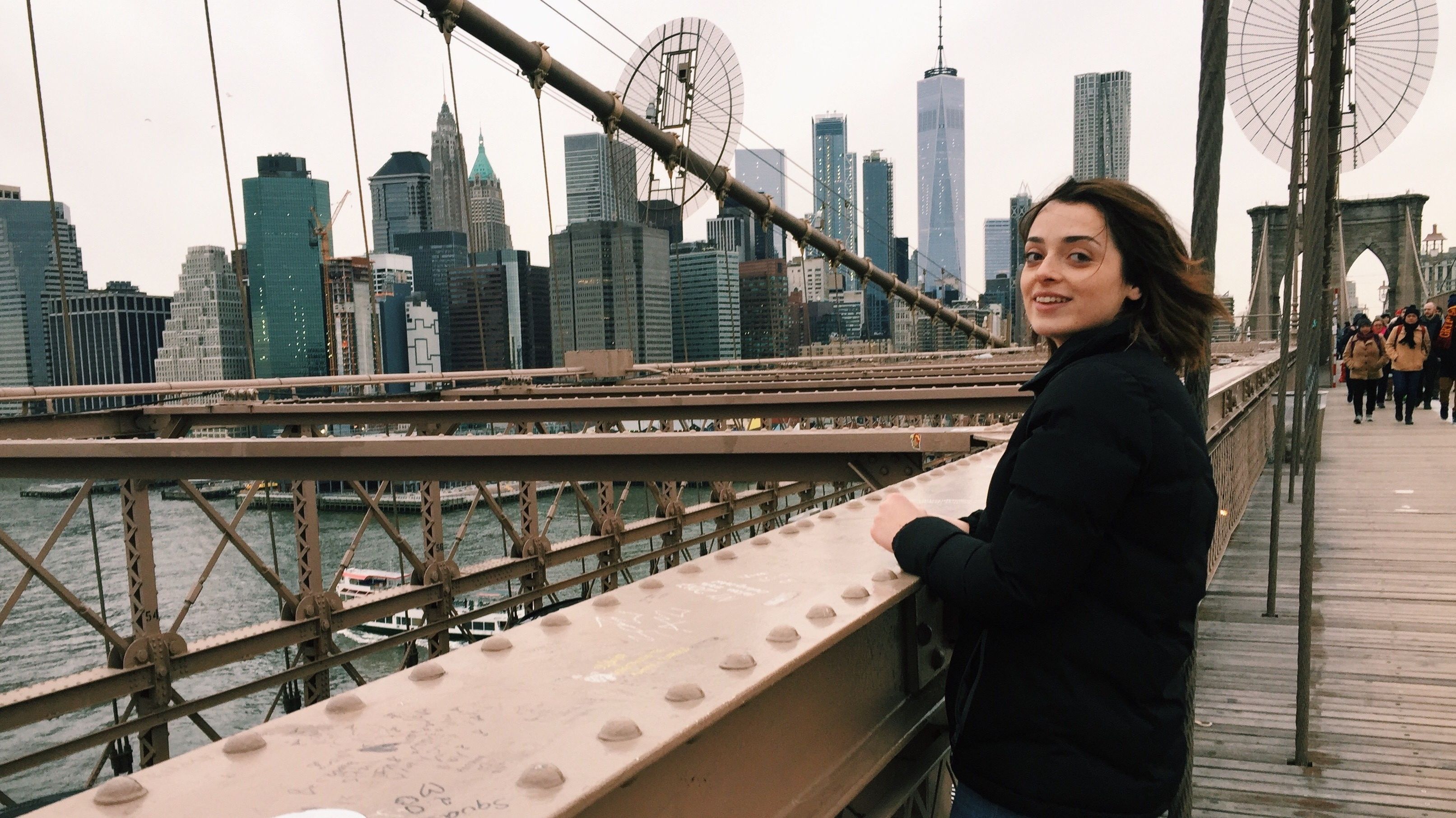 Study abroad student Yazmine in New York City on the Brooklyn Bridge.