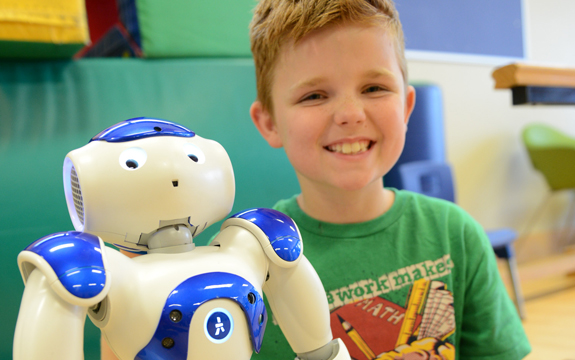 NAO, the humanoid robot with nine year old Miles, who is recovering from injury.