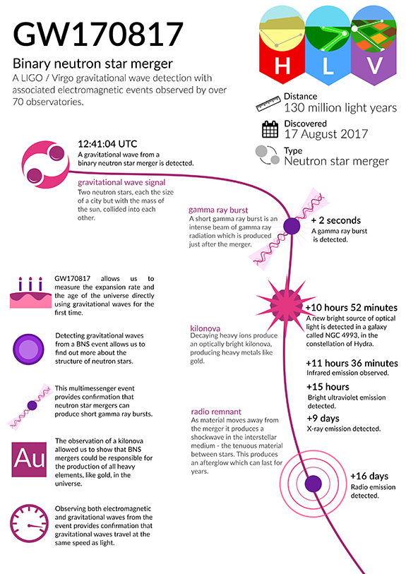 On 17 August, about two seconds after the gravitational wave detection by the LIGO and Virgo gravitational wave detectors, the FERMI Gamma-Ray Space Telescope detected a burst of gamma-rays, the most energetic form of electromagnetic radiation.
