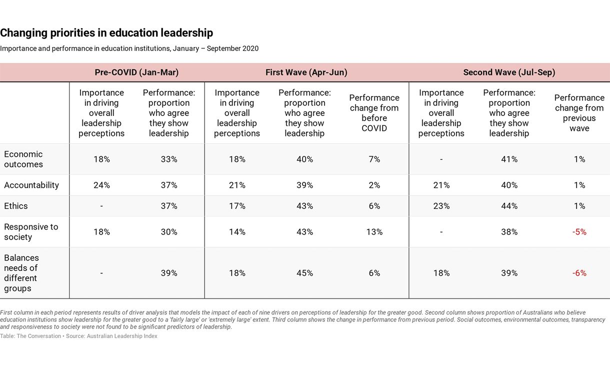 The Australian Leadership Index has tracked public perceptions of leadership across a number of sectors, including public education, since 2018. We analysed ALI scores for public education through three periods – before COVID, first wave and second wave.