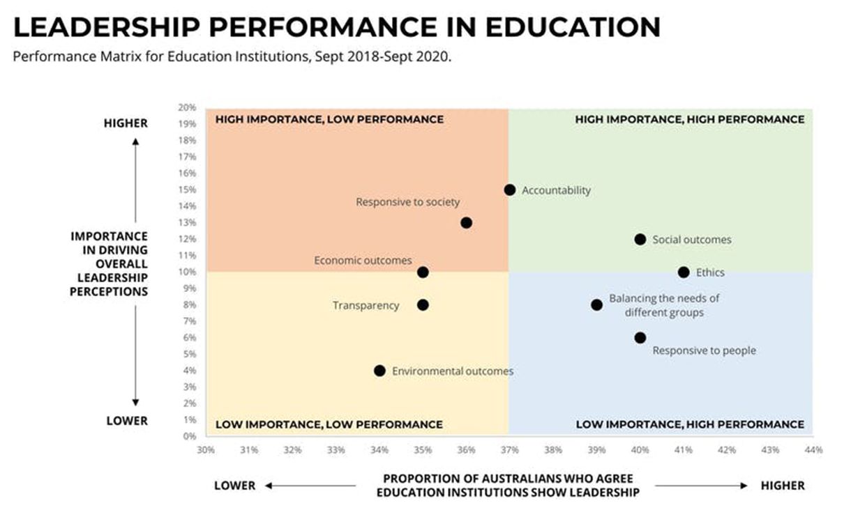 Notably, Australians see accountability, ethicality and creating social value as highly important for education institutions. The sector performs well against these factors.