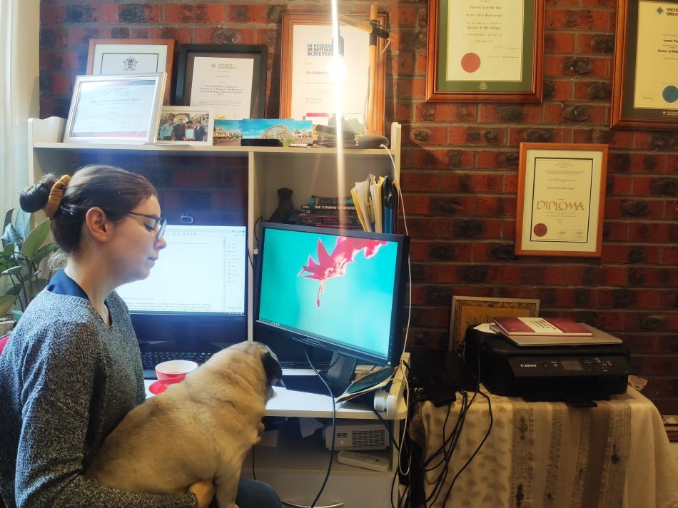 Dr Balanzategui’s working from home setup includes Samus the pug, who regularly appears in her lectures.