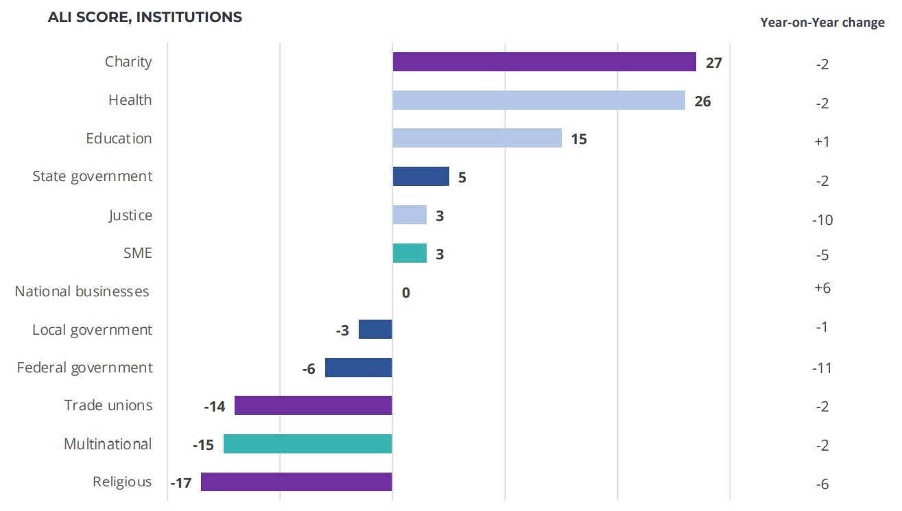 At a sector level, people generally only regard the public sector as showing leadership for the public good. Charities lead the way, followed by public health institutions. However religious institutions and trade unions have fallen further behind.