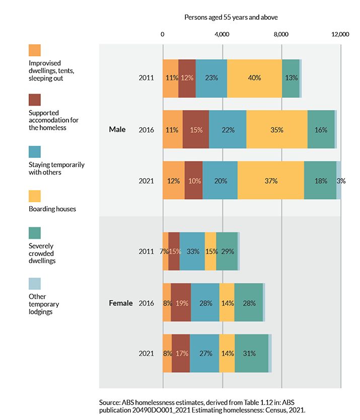 Older people experiencing homelessness by gender and category in 2011, 2016 and 2021.