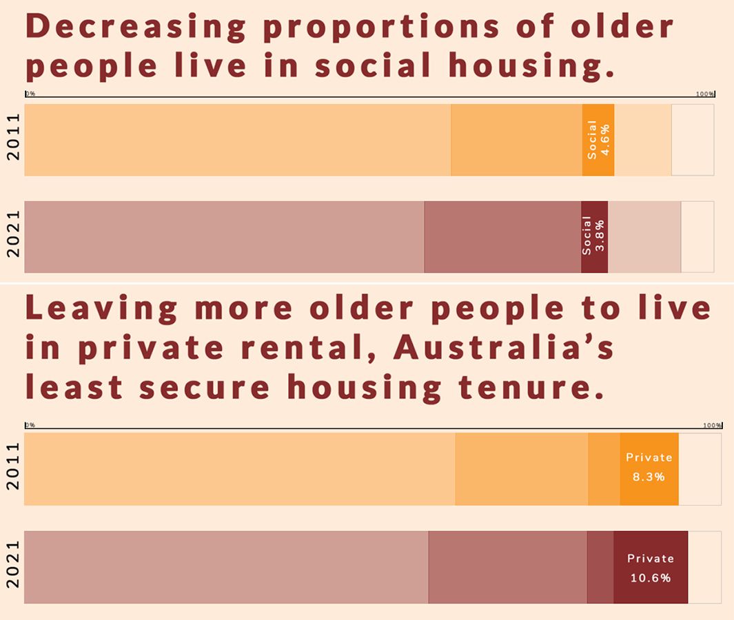 The proportion of older people in private rental housing has also increased. This means more older people are exposed to the insecurity of renting and rising rents. Our work shows they are struggling to afford private rental housing.