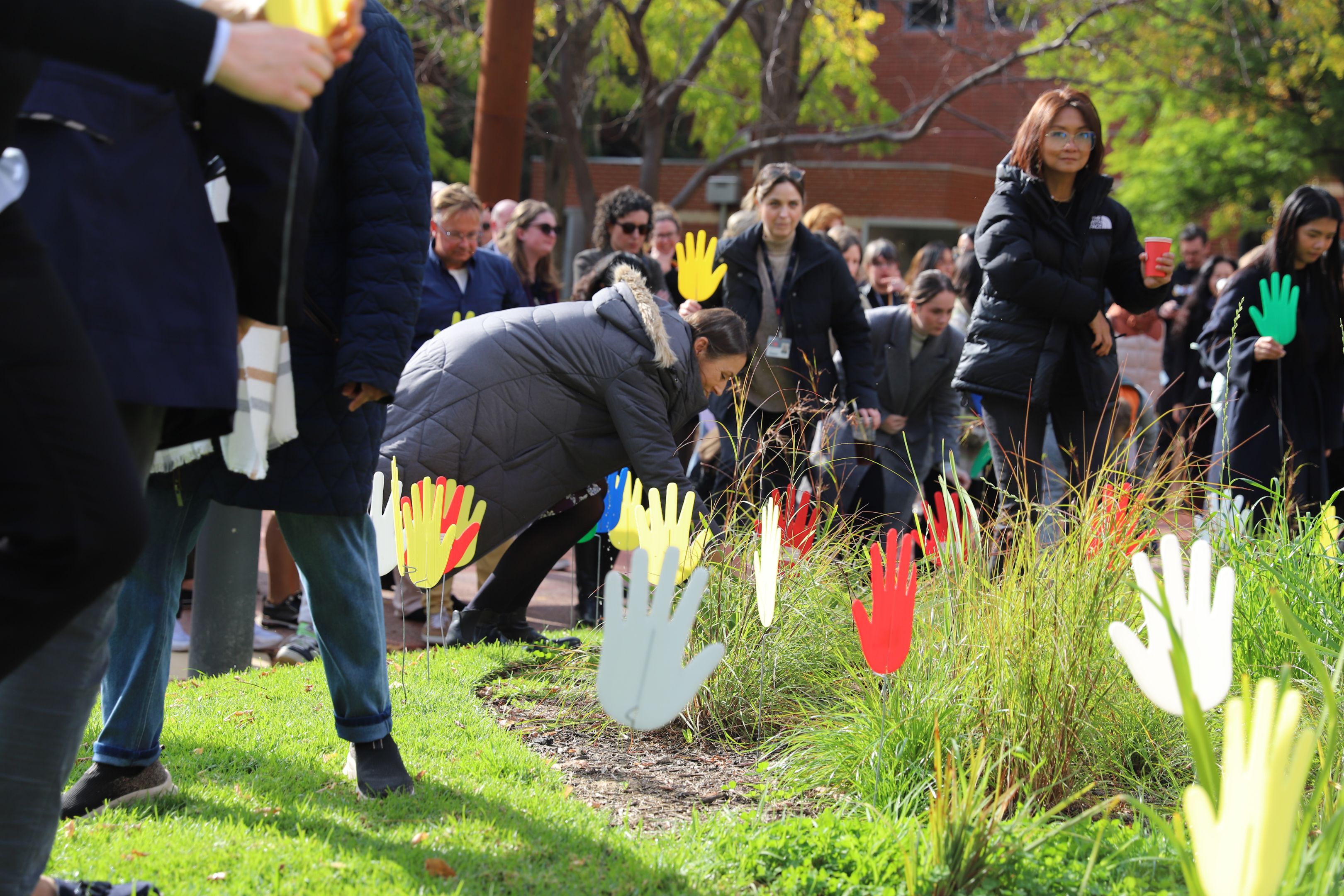 The service began with a Traditional Welcome to Country and Smoking Ceremony, led by Wurundjeri Elder Uncle Colin Hunter Jnr. Attendees then took part in the symbolic Sea of Hands installation, placing colourful hands in the Learning Circle. This act, inspired by Australians for Native Title and Reconciliation (ANTaR), serves as a powerful act of recognition of Aboriginal and Torres Strait Islander identity, culture and history.