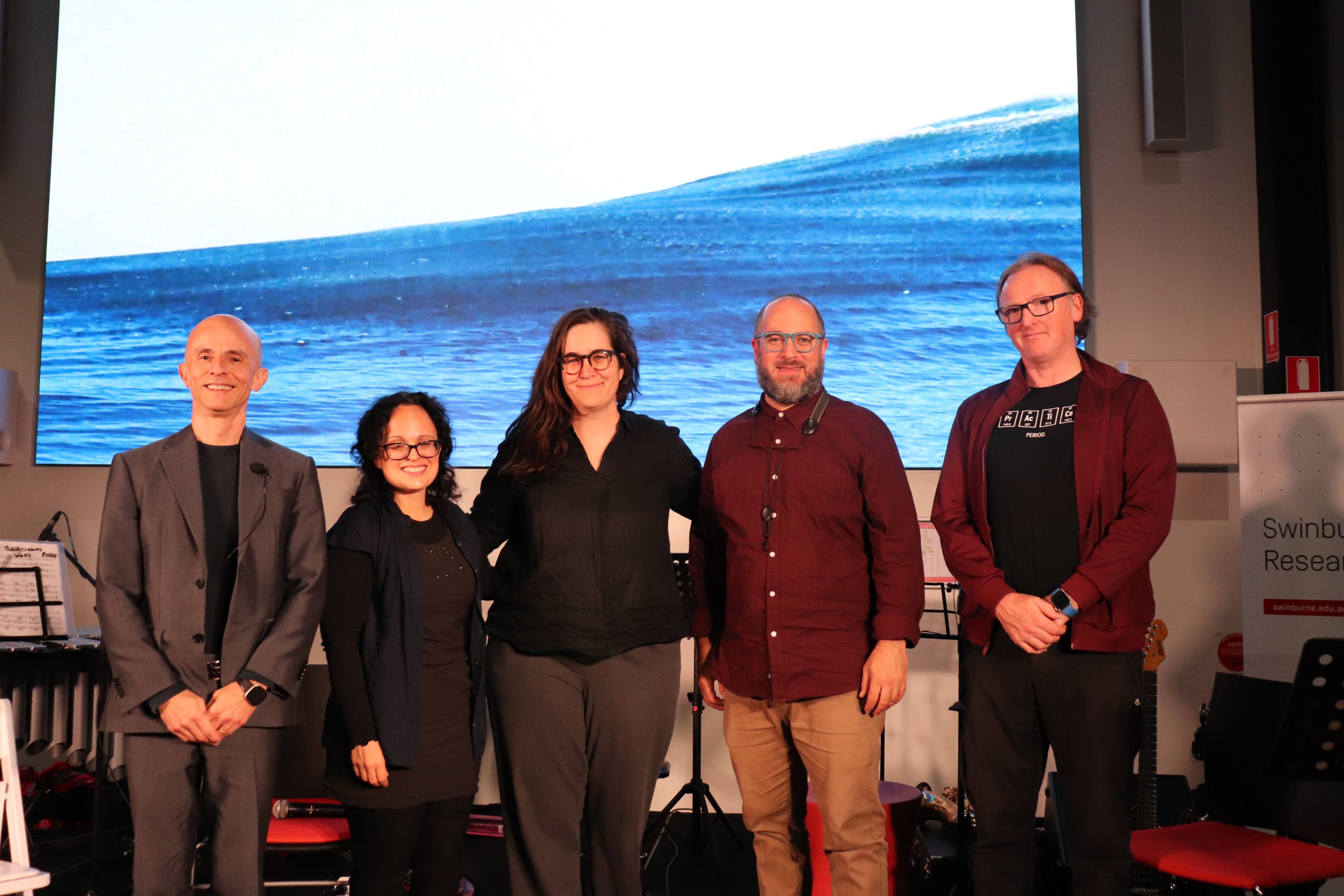 (from left) Professor Richard Manasseh and Elissa Goodrich and their ensemble at a production of their Bubbles and Waves work