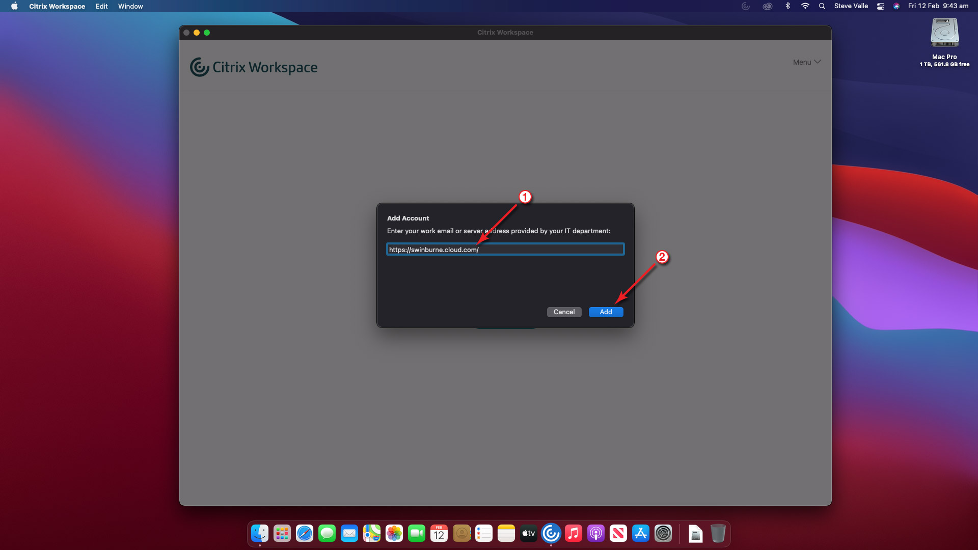 In the field provided, type https://swinburne.cloud.com/ and click on the Add