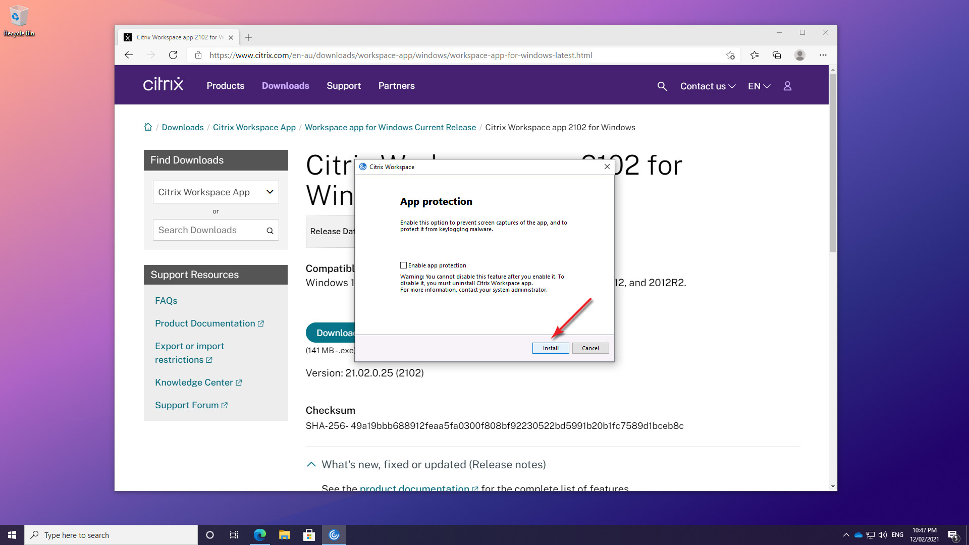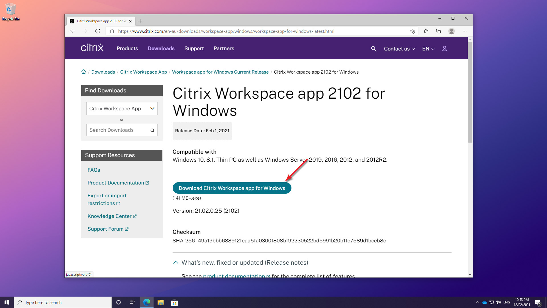 Scroll down the page and click on the Citrix Workspace app 2102 for Windows link